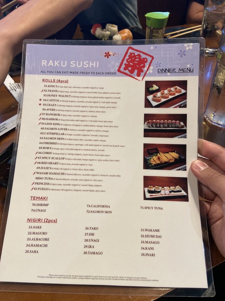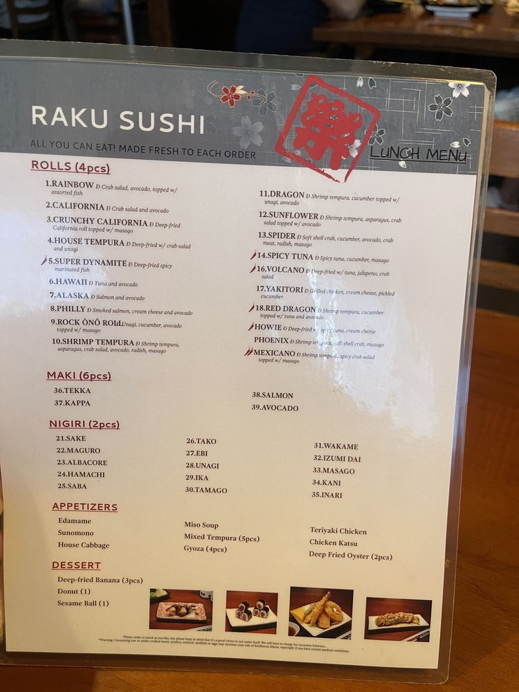 Raku Sushi, located in West Sacramento, offers a Japanese seafood dining experience with a focus on sushi. The restaurant provides various amenities such as reservations, delivery, takeout, and vegan options. With a casual atmosphere and good for groups and kids, Raku Sushi caters to a wide range of customers. Customers praise the prompt service and reasonable prices, especially during lunchtime. The menu features a variety of sushi rolls and nigiri options, with standout dishes like the hamachi nigiri, dragon roll, and fried rolls. However, some customers have noted inconsistencies in service quality. Overall, Raku Sushi provides a satisfying dining experience with its affordable all-you-can-eat sushi offering and diverse menu options.
