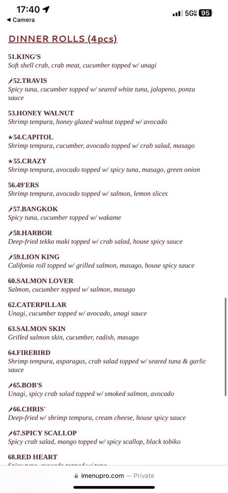 Maguro (pcs), sake (pcs), albacore (pcs), ebi (pcs), hamachi (pcs), ika (pcs), California roll (pcs), spicy tuna roll (pcs), kappa maki (pcs), dragon roll (pcs), rainbow roll (pcs)